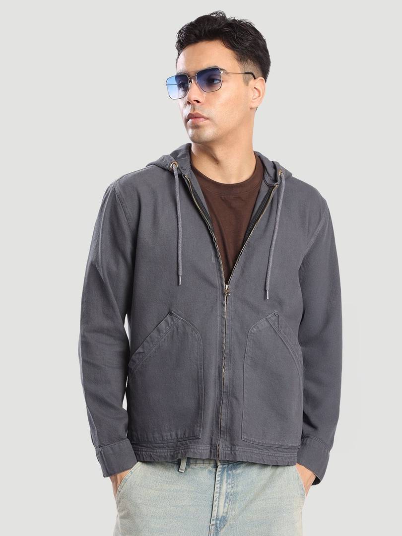 Metal grey hooded denim jacket crafted from 100% cotton for a relaxed fit and casual streetwear style. Featuring a solid pattern, zipper closure, and patch pockets, this light winter wear piece combines comfort and functionality for versatile urban fashion.