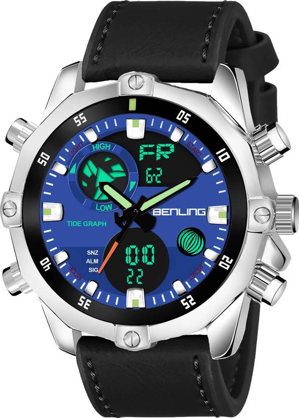 BL-1021-SLVRCASE-ROUND-BLU-BLACK Analog Digital Multifunctional Sports / Formal / Casual Watch Alarm Stopwatch EL Light for Boys | Gents | Men (Blue Dial, Black Leatherette Strap)