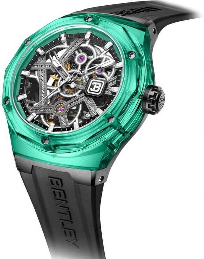 This stunning Bentley timepiece is a true testament to modern watchmaking excellence and avant-garde design. The watch features an eye-catching green bezel that effortlessly blends with its bold, skeletonized dial, showcasing the intricate inner workings of its high-performance Automatic BX1220 Movement. Every detail of the dial, from the exposed gears to the visible jewels, celebrates precision engineering and meticulous craftsmanship. The transparent design allows enthusiasts to admire the oscillating balance wheel and the fluid motion of the gears, a constant reminder of the watch’s mechanical mastery. Encased in a robust yet stylish build, the timepiece strikes a balance between sporty appeal and sophisticated elegance. The black rubber strap embossed with the Bentley name offers durability and comfort, making it perfect for daily wear or special occasions. Polished screws on the bezel add an industrial touch, enhancing its rugged charm. The crown is ergonomically designed for easy handling, complementing the overall seamless look. With its striking color palette, high-end movement, and iconic branding, this Bentley watch is more than just a timekeeper—it’s a statement of innovation and luxury on your wrist.