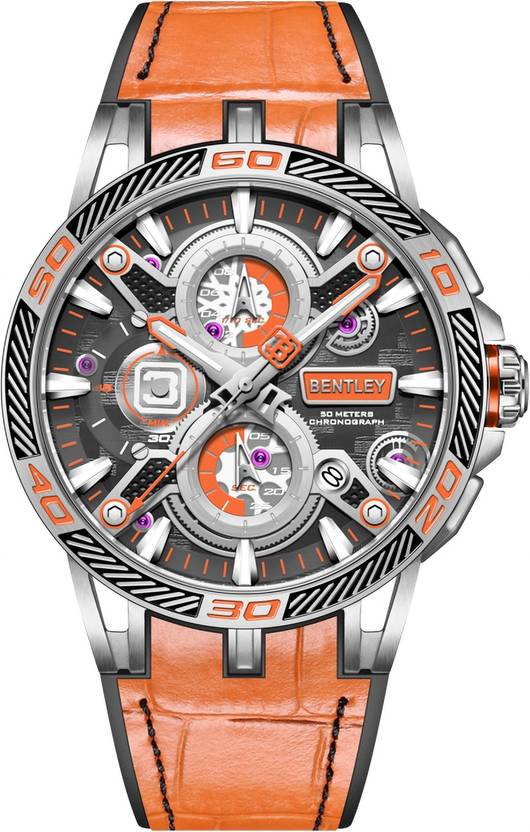 Experience the epitome of bold sophistication with this exquisite Bentley timepiece — a true masterpiece of horological craftsmanship. Powered by the distinguished Japan Seiko TMI-VD57 chronograph movement, it delivers impeccable precision and unwavering reliability. The intricately skeletonized dial reveals a captivating view into the mechanical soul of the watch, encased in lustrous stainless steel and adorned with opulent orange accents that radiate modern luxury. Every element is meticulously designed, from the trio of subdials offering elite chronograph functionality to the finely integrated date window that adds both elegance and utility. The sapphire-coated crystal glass offers superior scratch resistance and pristine clarity, shielding the artistry within. A boldly styled black-and-orange bezel encircles the dial, enhancing its commanding presence. The rich, genuine leather strap in signature Bentley orange is a tactile indulgence, ensuring comfort while accentuating its striking visual appeal. Water-resistant up to 50 meters, this timepiece is as resilient as it is refined. More than a watch — it is a statement of power, precision, and prestige. The Bentley chronograph invites you to wear time with confidence and grandeur.