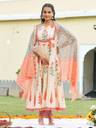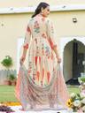 An off-white/cream flared Anarkali kurta with Orange Ethnic motifs & floral prints. It features a V-neckline, three-quarter sleeves, and a contrasting printed border along the neckline, waist, sleeve edges, and hemline. The flare adds elegance and flow, making it perfect for festive and semi-formal wear