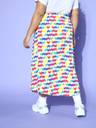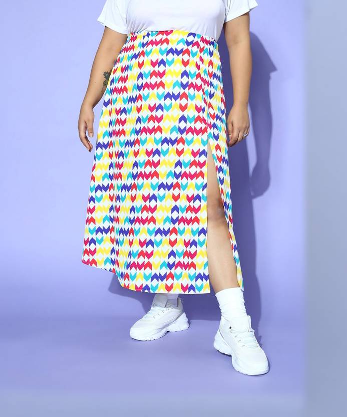 Bring in the fun with a pop of artistic design and colours by wearing this stunning White & Multicolour Geometric Printed Crepe Slip-On Thigh-High Slit Midi Skirt from Berrylush. Spun from high-quality crepe polyester fabric to keep you comfortable with its flexibility and delicate touch to your bare skin. Styled with zip closure to provide a secure fastening method with a smart outer appearance. Moreover, the woven detailing enhances the overall durability of this skirt with resistance from tear issues. Grab dinner with your loved ones looking gorgeous by wearing this beautiful skirt with a fitted top, a pair of block heels, minimalistic silver jewellery, and a clutch.