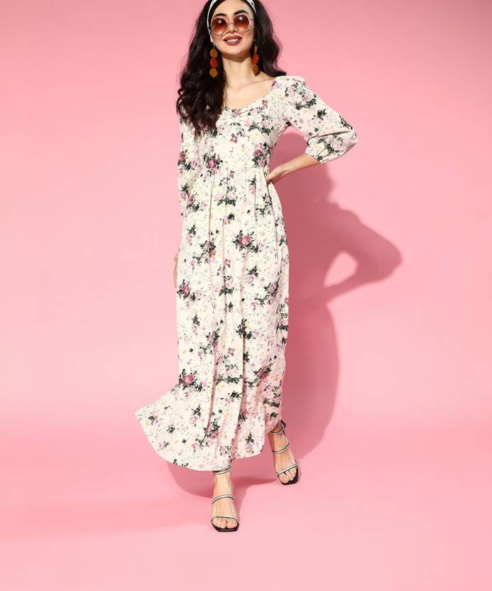 Introduce the most primary and beautiful essence of nature with this boho-chic Beige & Pink Floral Printed Sweetheart Neck Three-Quarter Sleeve Flared Maxi Dress from Berrylush. Detailed with a sweetheart neck design that gives this dress a magnificent styling element it further lends a lovely definition to your neckline. Frame in a maxi length that provides your gorgeous legs with proper coverage to keep them warm and comfy all day long. This maxi dress comes with woven detailing to offer a soft touch to your skin with flexible body movement. Enjoy your gorgeous look by wearing this maxi dress with a pair of high-heels, floral earrings, and a sassy purse.