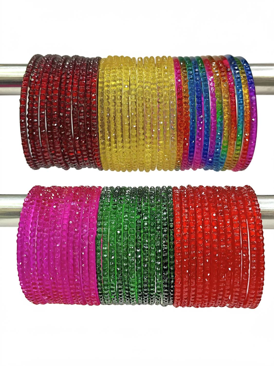 These elegantly crafted glass bangles from BEUTIFLY Bangles make for a stunning accessory. The set of glass bangles comes in a vibrant colors, each piece adorned with intricate beadwork designs. Handmade by skilled Indian artisans, the bangles have a classic round shape perfect for stacking or wearing alone. They fit most wrist sizes comfortably. Lightweight yet eye-catching, these bangles can jazz up any Indian or Western outfit from everyday casual wear to festive events. Their shining glass construction lends an air of sophistication, while the traditional beaded patterns add an ethnic touch. A versatile wardrobe essential, this bangle set is sure to attract appreciation and compliments from all. NOTE: The color may be little bit different from the images.