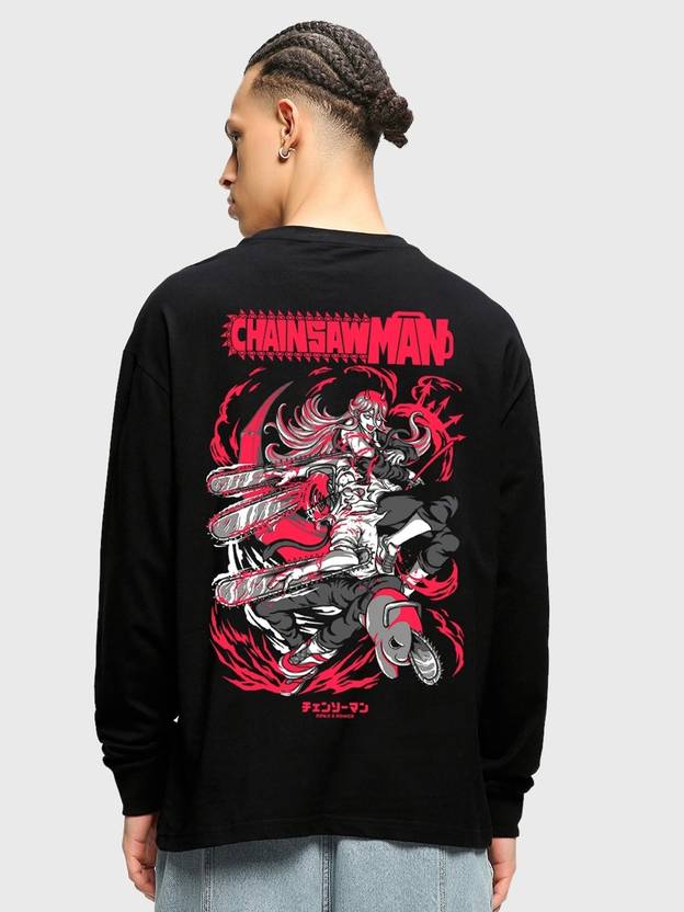 Possess one-of-a-kind power of erasing evil from the world and flaunt them with this Chainsaw Man Men's Oversized Full Sleeve T-shirt. Club this black t-shirt with denim and canvas shoes for a casual look.