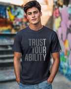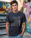 t-shirts, tees, men tees, men tshirts online, tshirts men, tshirt for men, single jersey tshirts, pure cotton tshirts, cotton tshirts, soft cotton tees, round neck, half sleeve, printed, regular, fits just right - not too tight, not too loose, single jersey, 100% cotton, classic, lightweight jersey fabric comprising 100% cotton, trust your ability half sleeve t-shirt navy blue, men t-shirt, trust your ability