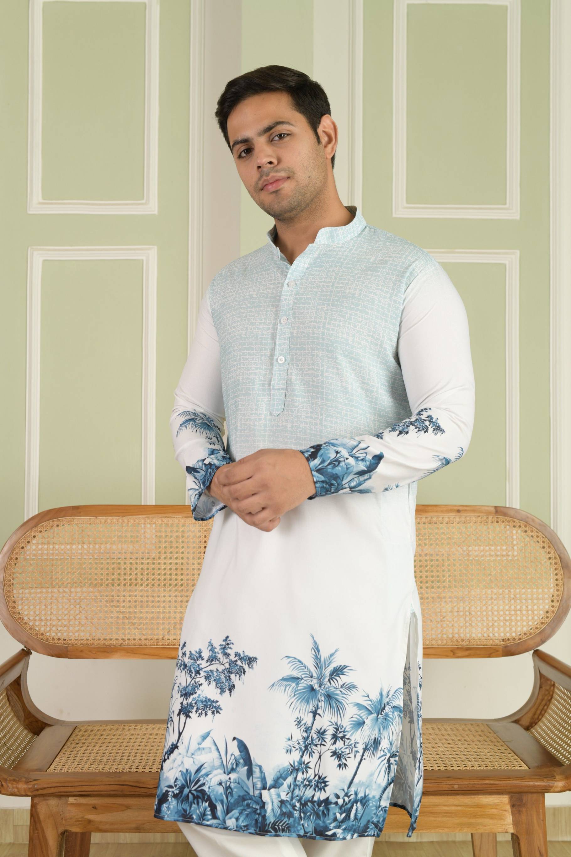 Step into celebration mode with this exquisitely digital printed kurta for men wedding — tailor-made for Diwali evenings, Navratri nights, and every festive moment in between. Impeccably woven with rich jacquard fabric and detailed embroidery, this set strikes the perfect balance between timeless tradition and contemporary comfort.
