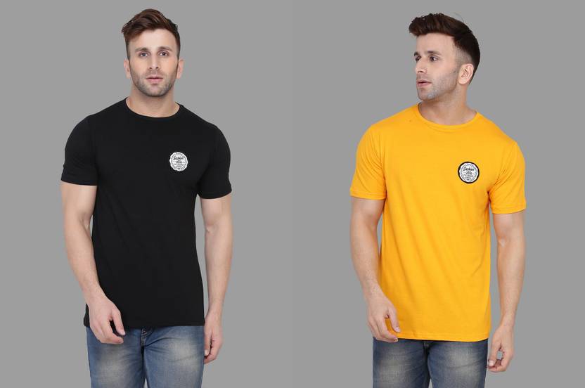 Pack of 2 Men Solid Round Neck Cotton Blend Black, Yellow T-Shirt