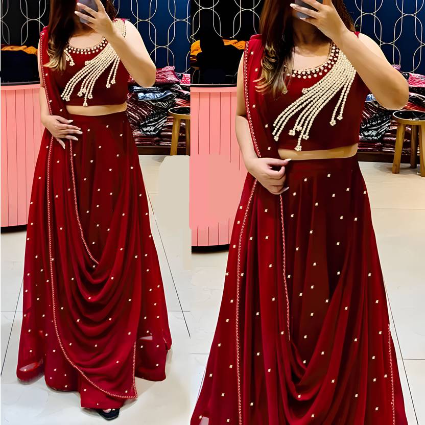Lehenga Fabric : georgette, Work : 9MM Sequence Embroidery Work, Size & Fit :- Lehenga Length: 45", Waist : Adjustable upto 42", Lehenga Flair : 4 Meter, Dupatta : 2.70 Meter, Blouse : Unstitched Piece
