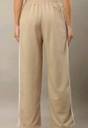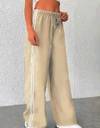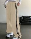 This is a pair of color athletic-style trousers featuring a relaxed, wide-leg fit. The pants have an elastic waistband with an adjustable drawstring for a comfortable and customizable fit. Running down the sides are two parallel white stripes, adding a sporty and stylish touch. The fabric appears to be lightweight and smooth, making it ideal for casual wear, lounging, or light workouts. The model pairs the trousers with white sneakers and a cropped top, emphasizing a trendy athleisure look.