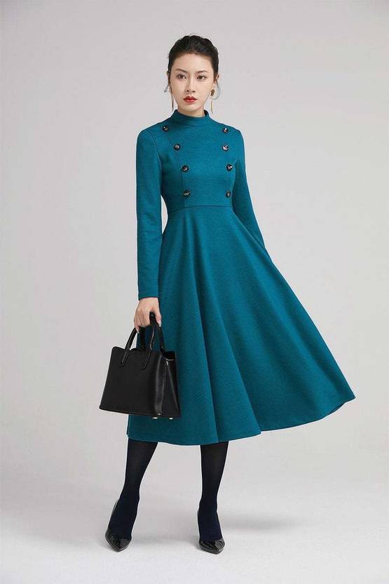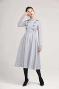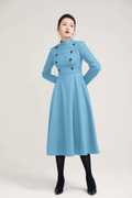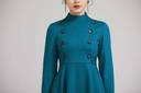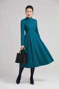 This Long Sky Blue dress design with midi length, match a black heel, make you more slim and high. This wool dress design with a smaller collar, so it open by back zipper, so that your head can through easily. This winter dress is warm in cold winter. it has a polyester lining, so don't need worry not comfortable