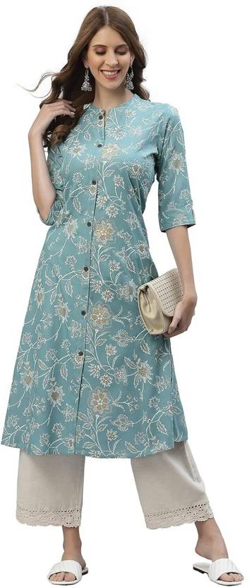 Women Polka Print Cotton Blend A-line Kurta (Blue)