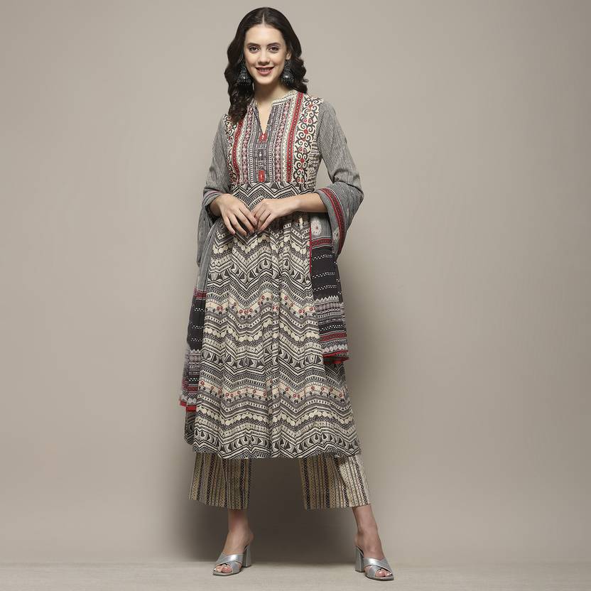 BIBA Women's Beige Cotton Anarkali Suit Set