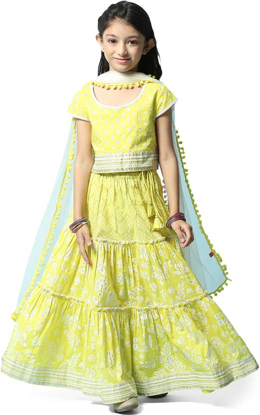Girls Lehenga Choli Fusion Wear Printed Lehenga, Choli and Dupatta Set (Yellow, Pack of 3)