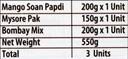 Mysore Pak 150 g, Bombay Mix 200 g, Mango Soan Papdi 200 g