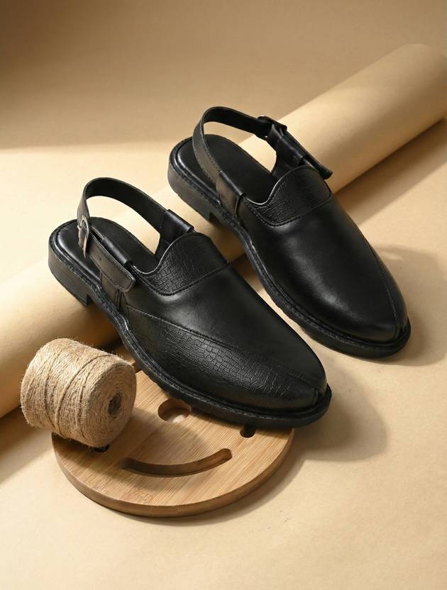 Men’s Black Peshawari Sandals – Classic Comfort for Everyday Wear Give your ethnic and casual looks a refined finish with these men’s brown Peshawari-style sandals. Crafted in a smooth synthetic leather upper with subtle croc-texture detailing on the vamp and sides, they offer a premium handcrafted feel while remaining easy to maintain. The open-back sling strap with adjustable buckle ensures a secure, customizable fit, while the slightly open toe design adds breathability for long hours of wear in warm weather. A cushioned inner footbed and sturdy, textured outsole provide comfort and grip, making them ideal for daily use, festive occasions, and semi-formal gatherings. Pair them with kurta-pajama, pathani suits, or even denims for a versatile, timeless style statement.