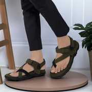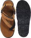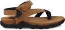 This product is a tan sandal designed for casual or outdoor wear, featuring an open-toe construction with a toe loop and supportive straps secured by velcro closures and a side button attachment. The sandal combines functional comfort with a rugged sole suitable for varied terrains, and visible contrasting stitching adds both durability and visual appeal. This men's sandal is crafted from tan suede material, featuring a unique toe loop and double-strap design for enhanced grip and support. The sandal sports a sturdy rubber outsole with textured grip, making it ideal for both everyday casual use and light outdoor activities. Adjustable velcro straps allow for a custom fit around the ankle and instep, while the cushioned footbed provides all-day comfort.
