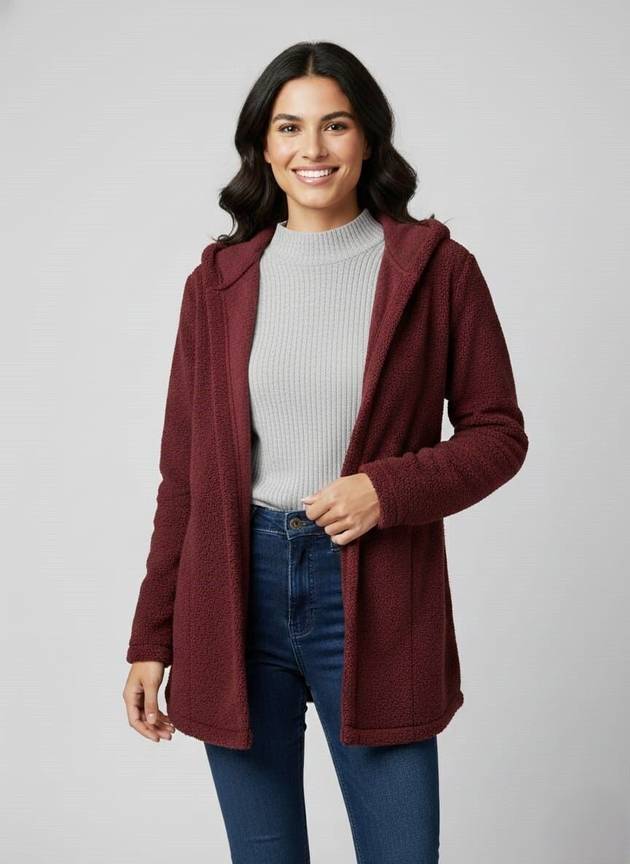 Category: Women’s Winterwear / Shrug / Sherpa Jacket/Jacket, Product Name: Bilbury Winter Wear Shrug for Women, Fabric: Woolen Blend Fleece, Fit Type: Relaxed Fit, Sleeve Type: Full Sleeves, Neck Type: Hooded Open Front, Pockets: 2 Side Pockets, Closure Type: Open Front, Closure Type: Open FrontCare Instructions: Hand wash or gentle machine wash; do not bleach, Ideal For: Winter season, office wear, travel, casual outings, daily use