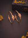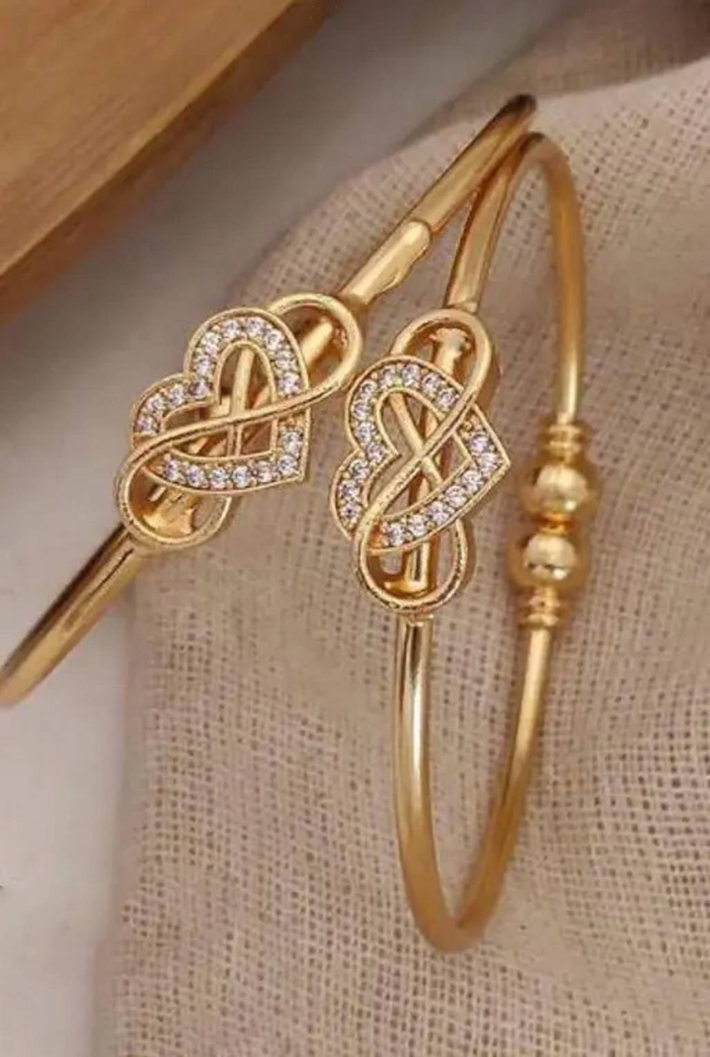 This charming image presents a pair of slender, rose-gold toned bangles, each featuring a captivating heart-shaped centerpiece encrusted with dazzling clear stones, likely cubic zirconia or diamonds, that catch the light beautifully. The delicate curve of the bangles, combined with small, textured bead-like embellishments near the sides of the heart, gives them a refined and romantic aesthetic. They are artfully displayed against a dark, smooth surface, allowing their subtle shimmer to stand out, while a dark, possibly checkered or geometric-patterned jewelry box in the background, accented by sprigs of delicate yellow flowers, adds a touch of thoughtful presentation and soft contrast to the elegant jewelry.