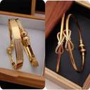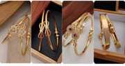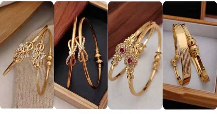 This captivating collage displays four distinct styles of gold-toned bangles, each offering a unique design aesthetic. From left to right, the first pair features an elegant infinity knot motif, delicately embellished with sparkling clear stones, exuding a modern and symbolic charm. The second set, though similar in style, showcases a slightly different interpretation of the knotted design, presented within a rustic wooden box, highlighting their refined simplicity. The third pair radiates traditional grandeur with ornate, floral-inspired centers adorned with vibrant ruby-red gems and shimmering clear stones, evoking a classic appeal. Finally, the fourth set presents a more contemporary design with a combination of smooth, polished surfaces and intricate textured patterns, accented by spherical beads, suggesting a blend of tradition and modernity. Together, these images beautifully illustrate the diverse range of craftsmanship and design available in gold-toned bangles, catering to varied tastes and occasions.