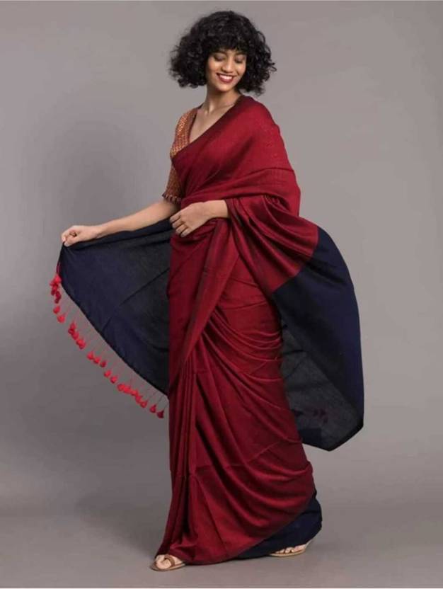 Solid/Plain Handloom Cotton Blend Saree (Red, Dark Blue)