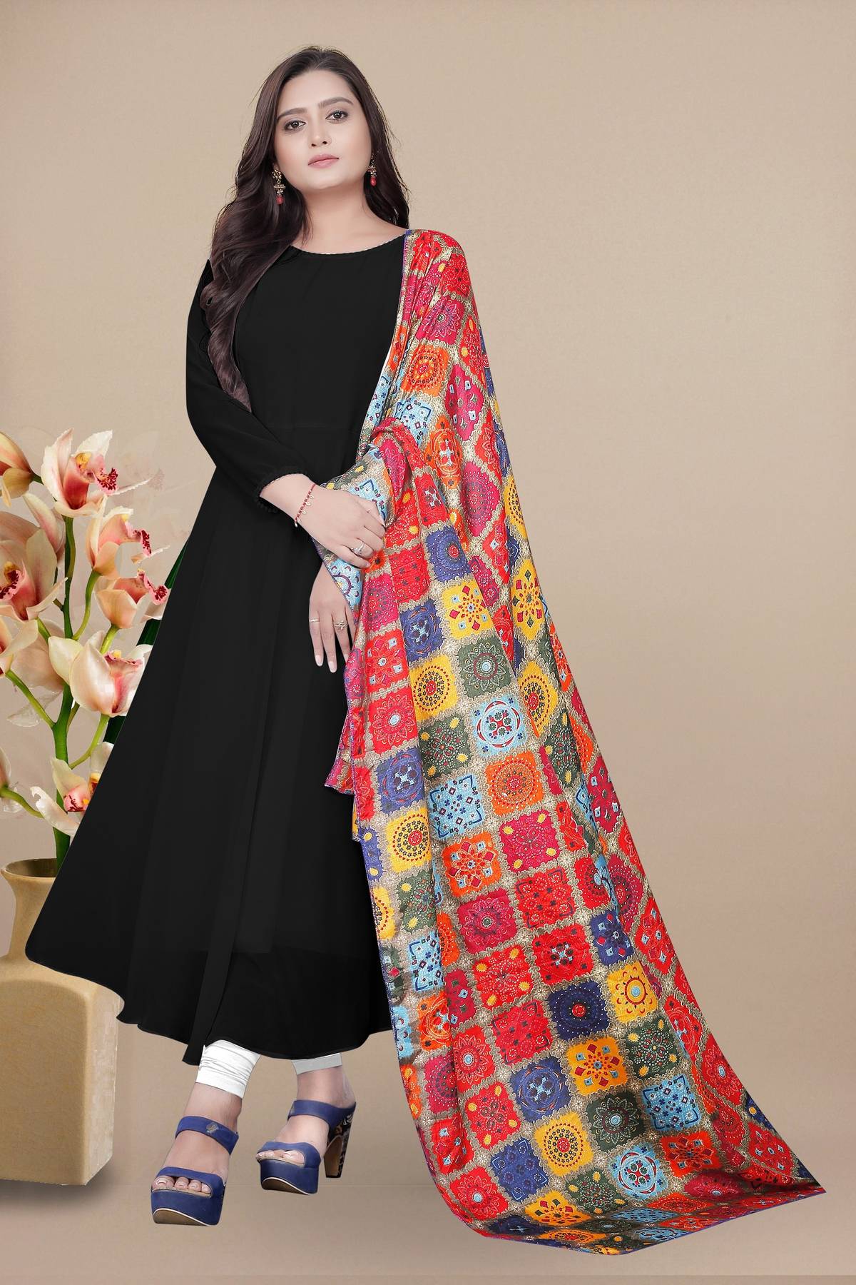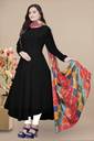 Printed Georgette Stitched Anarkali Gown (Black, Orange)