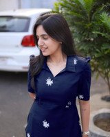 Sporting a collared neck and short sleeves, this kurta offers a structured yet comfortable fit. The uniquely styled short sleeves, this kurta offers a modern touch while ensuring ease of movement. The straight cut provides a sleek silhouette, while the calf-length design allows ease of movement. Thanks to its adaptable style, this kurta pairs well with leggings for a polished appearance or with palazzos for a relaxed feel, making it suitable for different styling preferences.