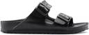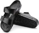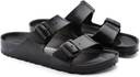 The Birkenstock Gizeh EVA sandals are a lightweight and waterproof thong-style sandal, presented in a sleek black color. They feature an anatomically shaped footbed designed for comfort and support, along with a durable, textured sole for reliable grip. The upper is a single piece of EVA material, including a toe post and an adjustable buckle strap over the instep, allowing for a fit. These sandals are perfect for casual wear, especially in wet environments like beaches, pools, or gardens. They are compatible with casual summer attire such as shorts, sundresses, swimwear, casual skirts, and can be accessorized with beach bags or casual tote bags.