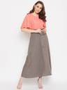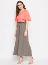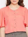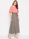 This clothing set consists of top and skirt Coral front button solid top, has a V-neck, short sleeves Brown solid skirt, has a slip-on closure, tie-up on the front
