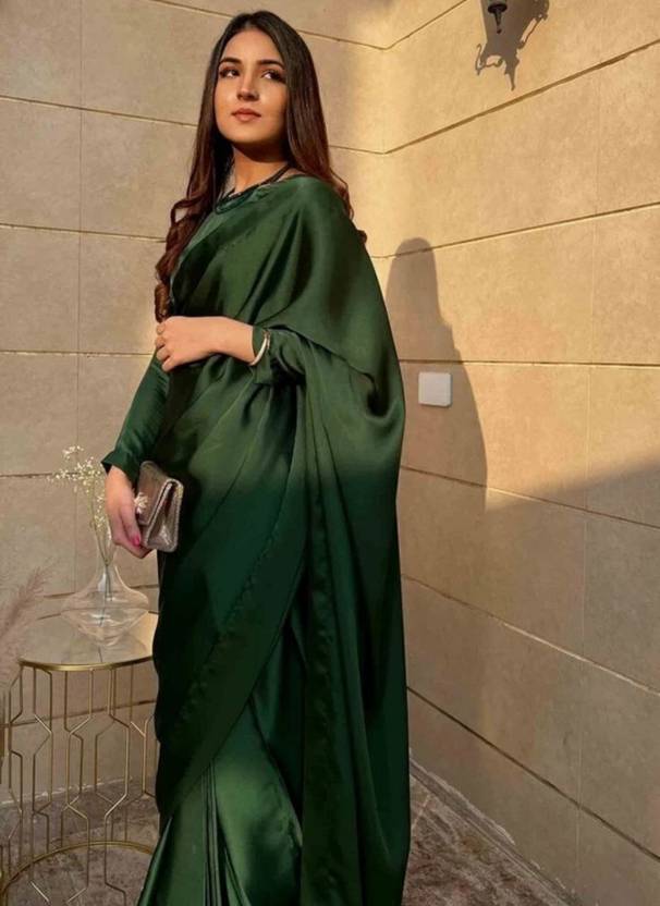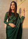 The saree in the second image is an elegant and modern deep forest green satin saree, styled with a minimalist and sophisticated aesthetic. Here's a detailed description: