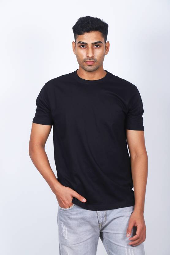 BLAKENTO Men Solid Round Neck Pure Cotton Black T-Shirt
