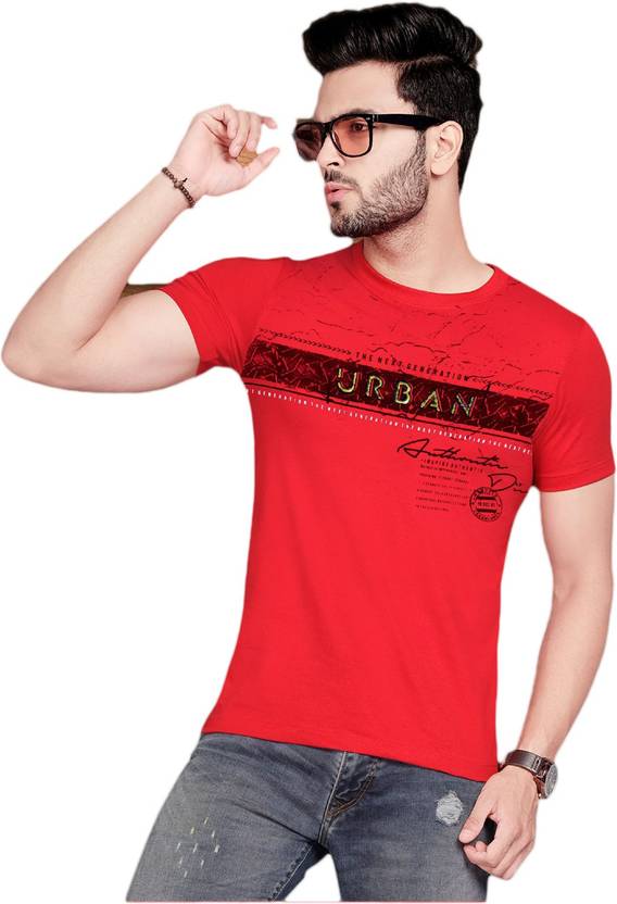 Men Printed Round Neck Cotton Blend Red T-Shirt