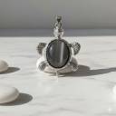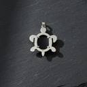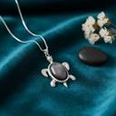 This turtle gemstone pendant features a striking turquoise-blue oval stone set at the center of a finely crafted silver-tone turtle design. The gemstone displays natural marbling patterns, giving each pendant a unique and eye-catching appearance. The turtle’s head, flippers, and tail are detailed with a textured finish, adding depth and an artisanal look to the piece.