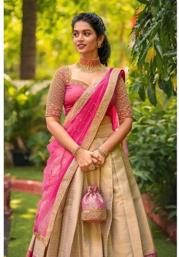 What is the meaning of half saree? A langa voni (also called "pavadai daavani" in Tamil or "langa daavani" in Kannada) is a traditional dress worn in South India by young girls between puberty and marriage. It is also known as the two-piece sari or half sari. Young girls between puberty and marriage wear this dress.