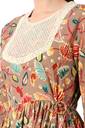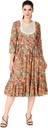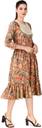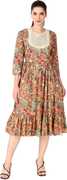 100% rayon in this beautifully designed ethnic dress by BoheeWohee. Adorned with front decoration, this dress exudes ethnic charm. The back single button opening adds a touch of practicality to the dress while maintaining a seamless design.The dress features 3/4 length sleeves, offering a blend of styles for various seasons.The gathered waist with side ties and a frill at the bottom not only enhances your figure but also adds a trendy, feminine touch to your look.