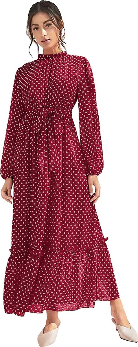 Polka Print, Printed Georgette Stitched Flared/A-line Gown (Maroon)