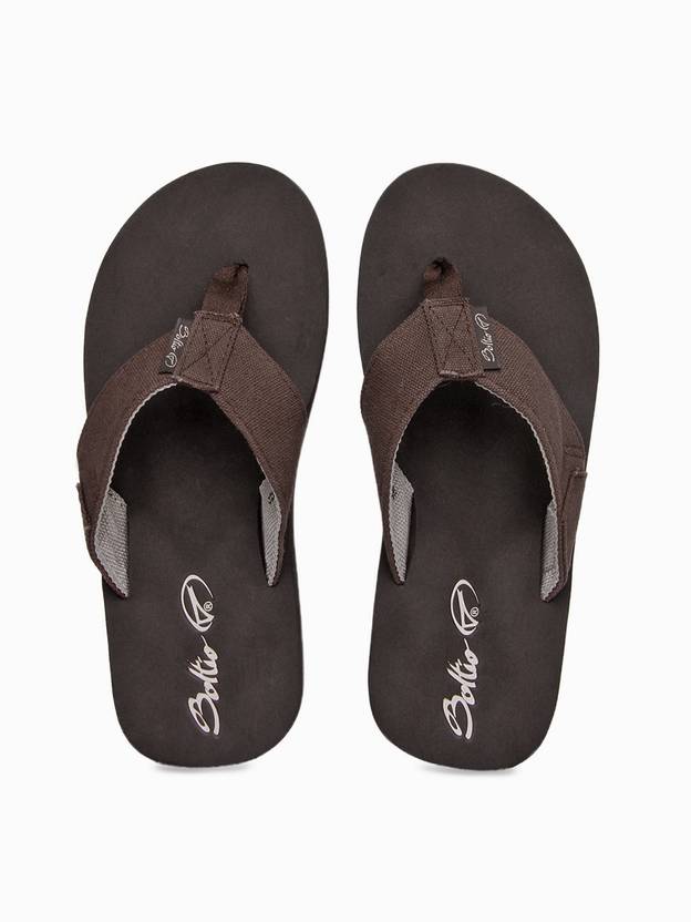 A pair of open-toed brown flip-flops with slip-on styling. Fabric thong-style upper with branding. Comfortable footbed with branding on the heel. Textured EVA rubber outsole with multiple branding. Give a spunky makeover to your casuals with this pair of flip-flops from Boltio. Team it with a pair of shorts and a printed tee for a casual look.