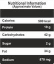 Nutrient Content | - Energy 565 kcal (7.85%), Protein 7.0 g, Carbohydrate 48.86.1 g, Total Sugars 4.01 g, Total Fat 37.53 g (6.2%), Trans Fat* 0.01 g (0.3%)