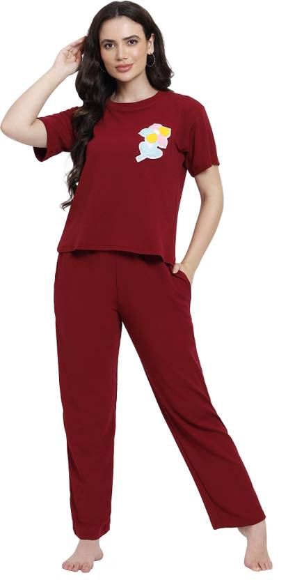 Bombshell Women Solid Maroon Top & Pyjama Set