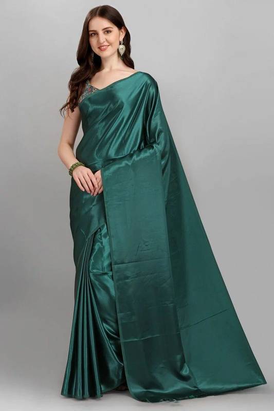 Introducing our premium Teal Green Color Satin Silk Saree, a Bollywood-inspired classic designed to make you stand out at every event. Please note: No blouse is provided with this saree. This stunning drape is crafted in luxurious shiny satin silk, giving it a soft, smooth, and elegant fall -perfect for evenings, parties, and special occasions.
