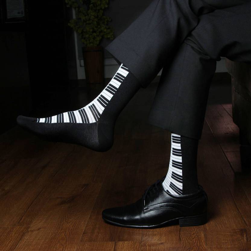 Piano print socks are a fun and quirky fashion accessory that can add a touch of musical style to any outfit. Featuring a repeating pattern of piano keys and sometimes even musical notes, these socks are a playful nod to the world of music. Piano print socks come in a variety of colors and styles, from classic black and white to bright and bold hues. They can be paired with dress shoes for a subtle touch of whimsy or worn with sneakers for a more casual and eclectic look. Whether you're a musician yourself or just appreciate the art of music, piano print socks are a unique and charming addition to any wardrobe.