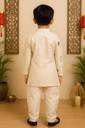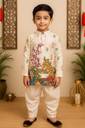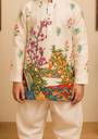 Dress your little boy in style with this elegant boys' ethnic kurta pajama set. Made from soft and breathable fabric, this cream kurta features a colorful floral and nature-inspired print, perfect for festive wear, weddings, or traditional functions. The set includes a comfortable churidar-style pajama and mojari-style shoes for a complete ethnic look. The kurta has a mandarin collar with button placket, adding a smart touch.