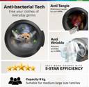 The innovative technology minimizes tangles in laundry by up to 50%, reducing fabric stress and ensuring your clothes emerge tangle-free and damage-free, saving you time on ironing and maintenance for hassle-free convenience