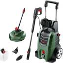 Motor power: 1900 W, Max. pressure: 130 Bar, Max. flow rate: 420 l/h, Max. flow temperature: 40 °C, Comes complete with: Bosch high-pressure gun,Lance, 7 m high-pressure hose, Deluxe patio cleaner (long lance), Fixed fan jet nozzle, Rotary nozzle, 90° nozzle, High pressure detergent nozzle, 550 ml Water filter, metal