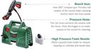 | Key Features | - Motor power- 1200 W, Max. pressure- 100 bar, Max. flow rate- 300 l/h, Max. flow temperature- 40 °C, Self priming capability- 0,5 m ,Detergent system- High pressure foam, Motor type- Series, Pump type- 3 cylinder, Cable length- 5 m, Hose length- 3 m (PVC) ,Weight (without accessories)- 3 kg, Lances- Lance Hose reel Manual, The Bosch 360° Gun allows the jet to be angled so even unseen dirt can be easily removed, One-handed operation means the free hand can hold lighter items or move the item whilst cleaning, making the process quicker and more thorough.Warranty: 6 months on product and for any queries reach out to 18004258665 ., The nozzle can be adjusted from a forceful cleaning jet to gentle rinsing, ideal for windows The high-pressure detergent nozzle reduces cleaning time by quickly applying the soap. Ideal for deeper cleaning on cars or waste bins.Includes: Pressure washer, Hose pipe, Fan jet nozzle and Pressure Gun, Compact, portable design with a broad base for extra stability