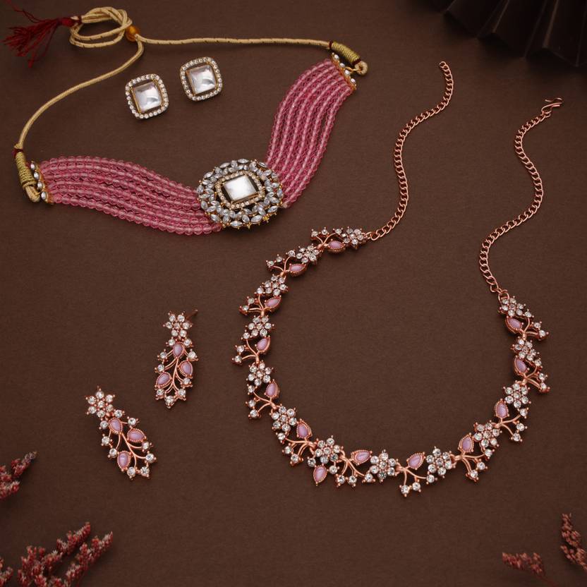 About - Polish: Gold and Silver. Material: Brass, Type: Choker set, Earring Type: Stud and Drop Earring, Stone: AD Studded, Necklace Clasp : S Hook and Drawstring Pack of 2 Silver necklace set with 2 Pair of Earring for Women and Girls. Crafted from high-quality brass material, this set exudes sophistication and style, perfect for women and girls a like. The necklace features a secure S hook and Drawstring clasp for easy wear. this set adds a touch of glamour to any outfit. Whether you're commemorating a birthday, wedding, or personal milestone, this set is sure to elevate your ensemble and make you feel special. Handcrafted with precision, it embodies timeless beauty and impeccable craftsmanship With its timeless appeal and exquisite detailing, it's the perfect choice for those seeking to enhance their style and grace with a touch of elegance. Traditional necklaces add a hint of raw ethnic beauty to any look. Representing a classic fusion of exquisite craftsmanship and feminine elegance, this set will definitely be a treasured inclusion in every woman's jewelry collection.