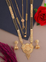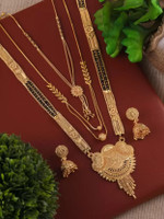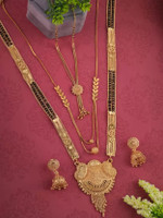 This mangalsutra set comes with a gold-plated finish that can give you an elegant look. The finest craftsmanship of this product ensures you get compliments wherever you go. Accentuate your look by bringing this ornament home and wearing it for a dressy vibe. The unique design is a must-have for jewellery lovers and can be styled with multiple outfits.