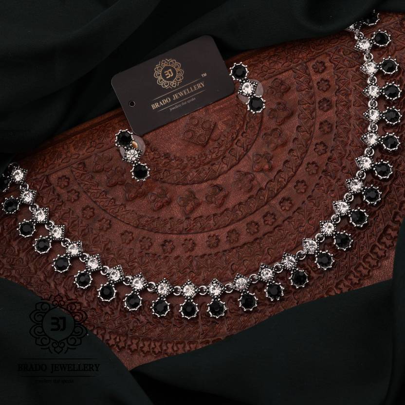 About Product :- Colour : Black and Silver, Material : Brass, Plating : Silver Plated.In The Box :- Pack of 1 Oxidised Silver Plated Black and white American Diamond Choker Jewellery Set Necklace + 1 Pair of Earrings.Dimension :- Necklace Length - 20.32 cm, Necklace Width - 15.24 cm| Earring Length - 2.08 cm, Earring Width - 2.54 cm.Material : Made With Pure Brass.This jewellery set consists of a necklace and a pair of earrings. Oxidised Silver-Plated Necklace, has Artificial Stone studded detail, secured with a S Hook closure. A pair of matching Drop Earrings, each secured with a Post and Back Closure.Brado Jewellery is a celebration of womanhood, a celebration of the life of a confident, down to earth woman who is here in today’s modern world with traditional sensibilities and a whole lot to give and share.Brado Jewellery brings the best, exquisite design jewelry to you at affordable prices. Our expert eye for craftsmanship, rarity, and quality can be seen through all of our flattering designs. This breathtaking necklace with earrings jewelry set is great for making a fashion statement. It will bring you a lot of compliments. Traditional necklaces add a hint of raw ethnic beauty to any look. Representing a classic fusion of exquisite craftsmanship and feminine elegance, this set will definitely be a treasured inclusion in every woman's jewelry collection. Best gifts for mother, sister, wife, and girlfriend. Features: Comfortable and lightweight Non-allergic to skin Beautifully crafted for a nice look Our Jewelry is designed to enhance inner beauty and confidence to offers an effortless complement to elegant outfits. This is a must-have design that can be worn on special occasions to boost up your style factor and enhance the beauty of yours.