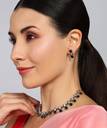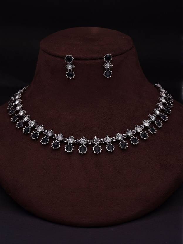 About Product :- Colour : Black and Silver, Material : Brass, Plating : Silver Plated.In The Box :- Pack of 1 Oxidised Silver Plated Black and white American Diamond Choker Jewellery Set Necklace + 1 Pair of Earrings.Dimension :- Necklace Length - 20.32 cm, Necklace Width - 15.24 cm| Earring Length - 2.08 cm, Earring Width - 2.54 cm.Material : Made With Pure Brass.This jewellery set consists of a necklace and a pair of earrings. Oxidised Silver-Plated Necklace, has Artificial Stone studded detail, secured with a S Hook closure. A pair of matching Drop Earrings, each secured with a Post and Back Closure.Brado Jewellery is a celebration of womanhood, a celebration of the life of a confident, down to earth woman who is here in today’s modern world with traditional sensibilities and a whole lot to give and share.Brado Jewellery brings the best, exquisite design jewelry to you at affordable prices. Our expert eye for craftsmanship, rarity, and quality can be seen through all of our flattering designs. This breathtaking necklace with earrings jewelry set is great for making a fashion statement. It will bring you a lot of compliments. Traditional necklaces add a hint of raw ethnic beauty to any look. Representing a classic fusion of exquisite craftsmanship and feminine elegance, this set will definitely be a treasured inclusion in every woman's jewelry collection. Best gifts for mother, sister, wife, and girlfriend. Features: Comfortable and lightweight Non-allergic to skin Beautifully crafted for a nice look Our Jewelry is designed to enhance inner beauty and confidence to offers an effortless complement to elegant outfits. This is a must-have design that can be worn on special occasions to boost up your style factor and enhance the beauty of yours.