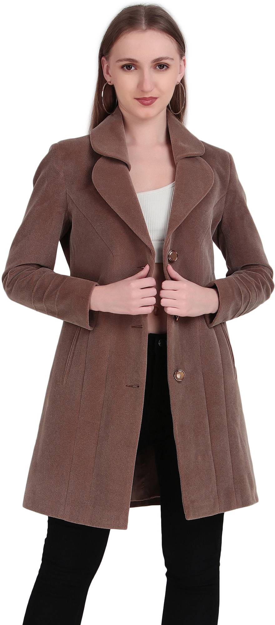 Stay warm and stylish with this Brazo women's coat, featuring a soft, solid colors that is easy to pair with any outfit. The coat has a flattering, fitted design with a classic collar, making it perfect for both casual and formal occasions. It has two convenient pockets and is secured with three matching buttons on the front for a neat and polished look.